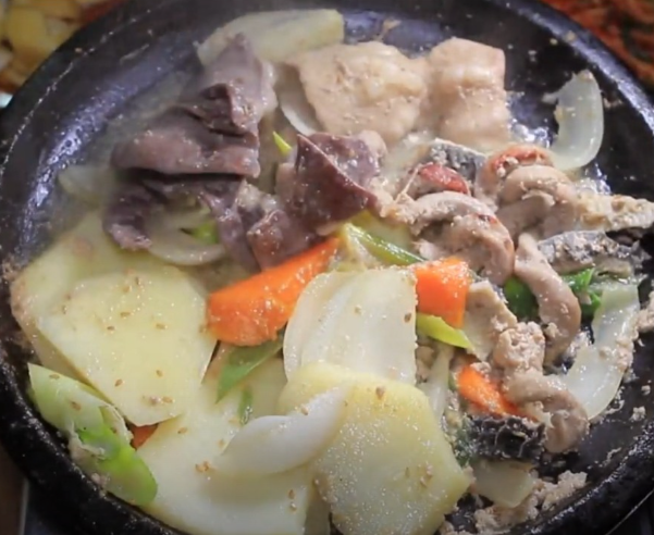 이 집의 대표 메뉴로, 24가지 한약재로 우려낸 육수에 곱창, 대창, 양을 넣어 끓인 후 구워 먹는 독특한 방식입니다. 육수가 졸아들면서 곱창에 깊은 맛이 배어들고, 특제소스와 매운소스에 찍어 먹으면 냄새 없이 부드러운 식감을 즐길 수 있습니다. 충청북도 향토음식경연대회에서 은상을 수상한 특허 상표등록 메뉴입니다.